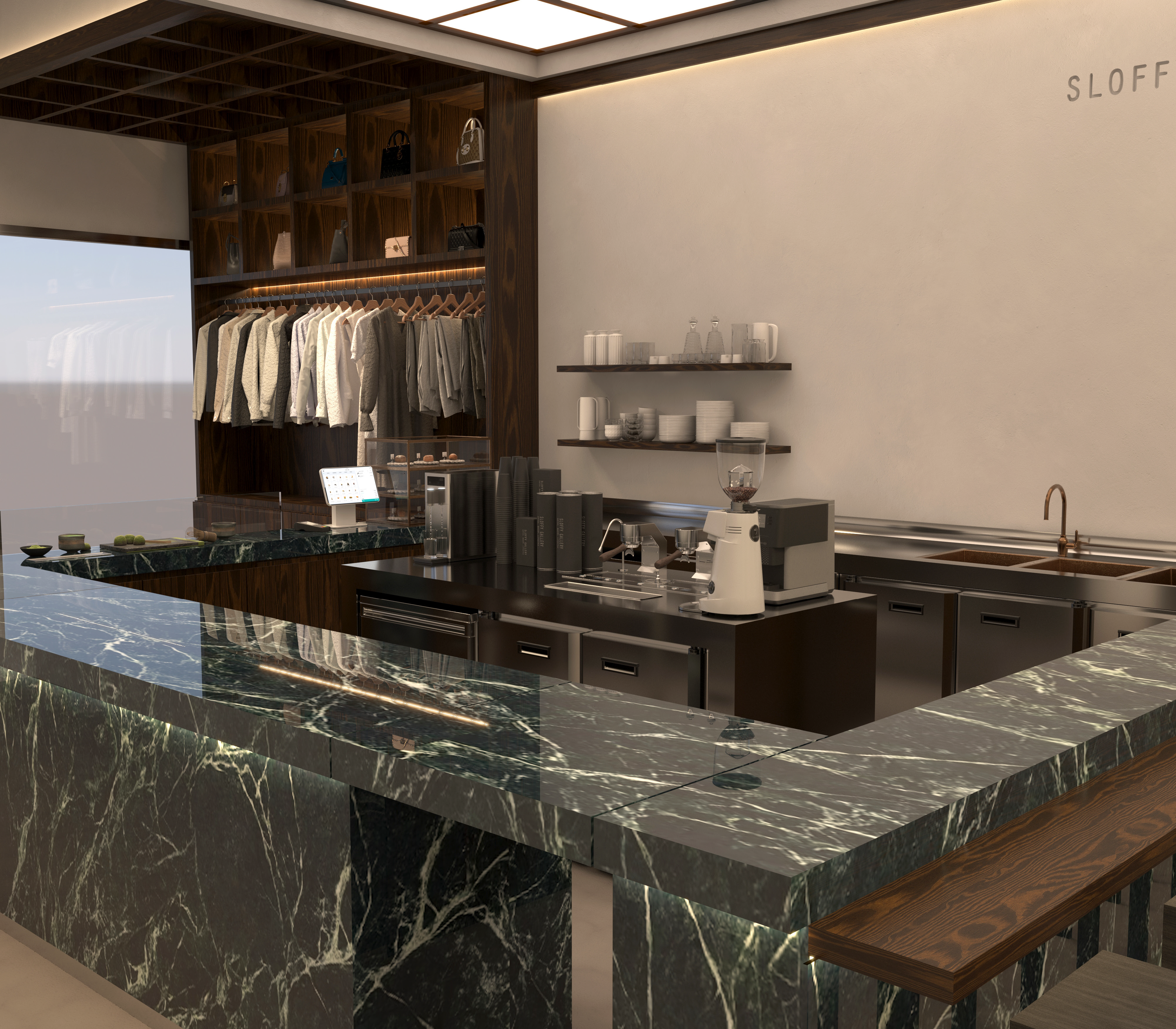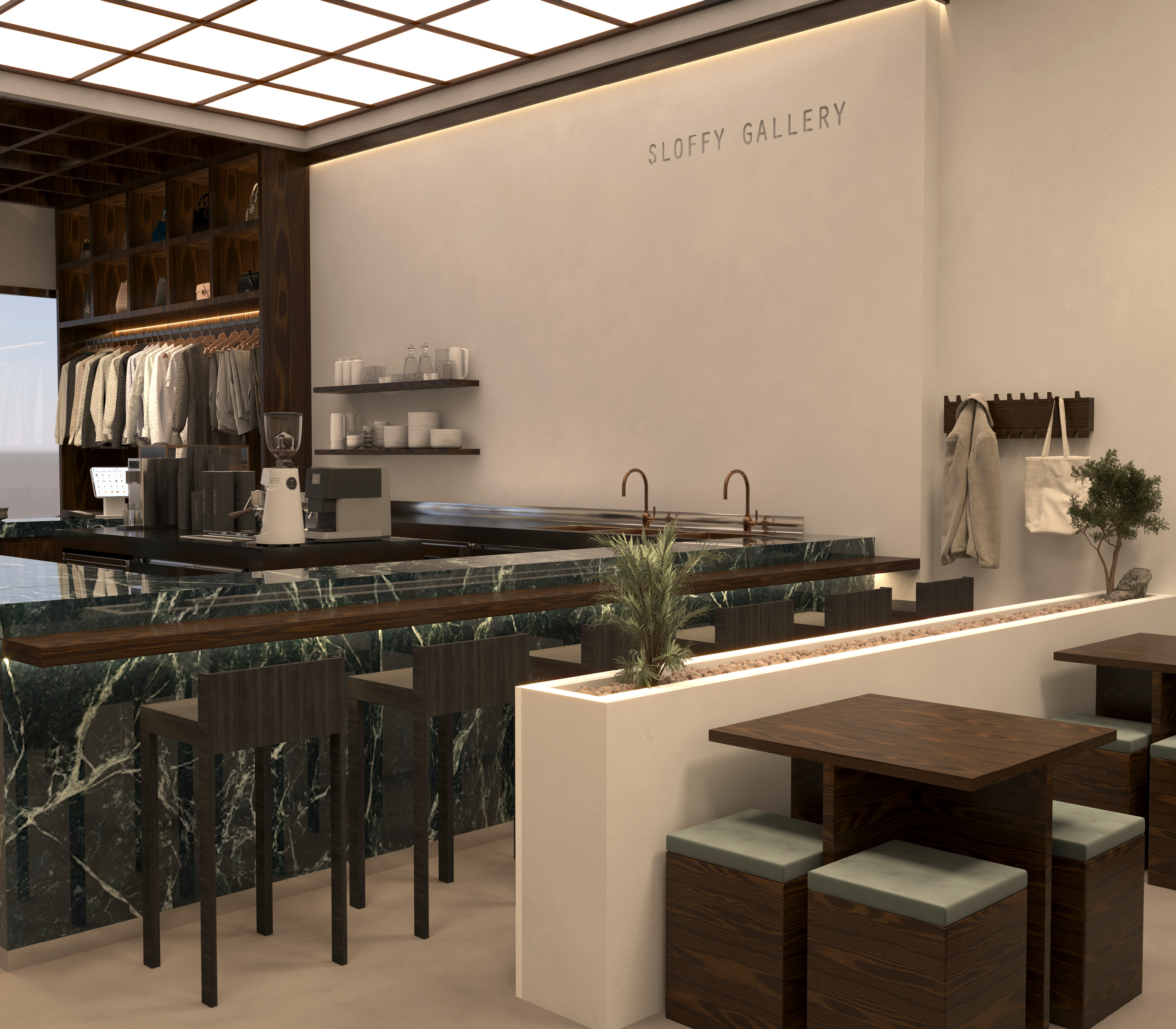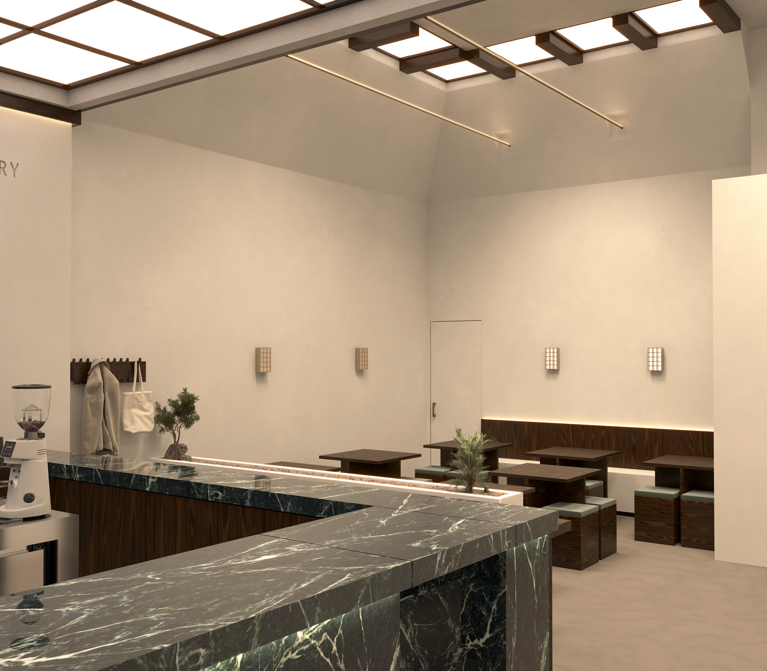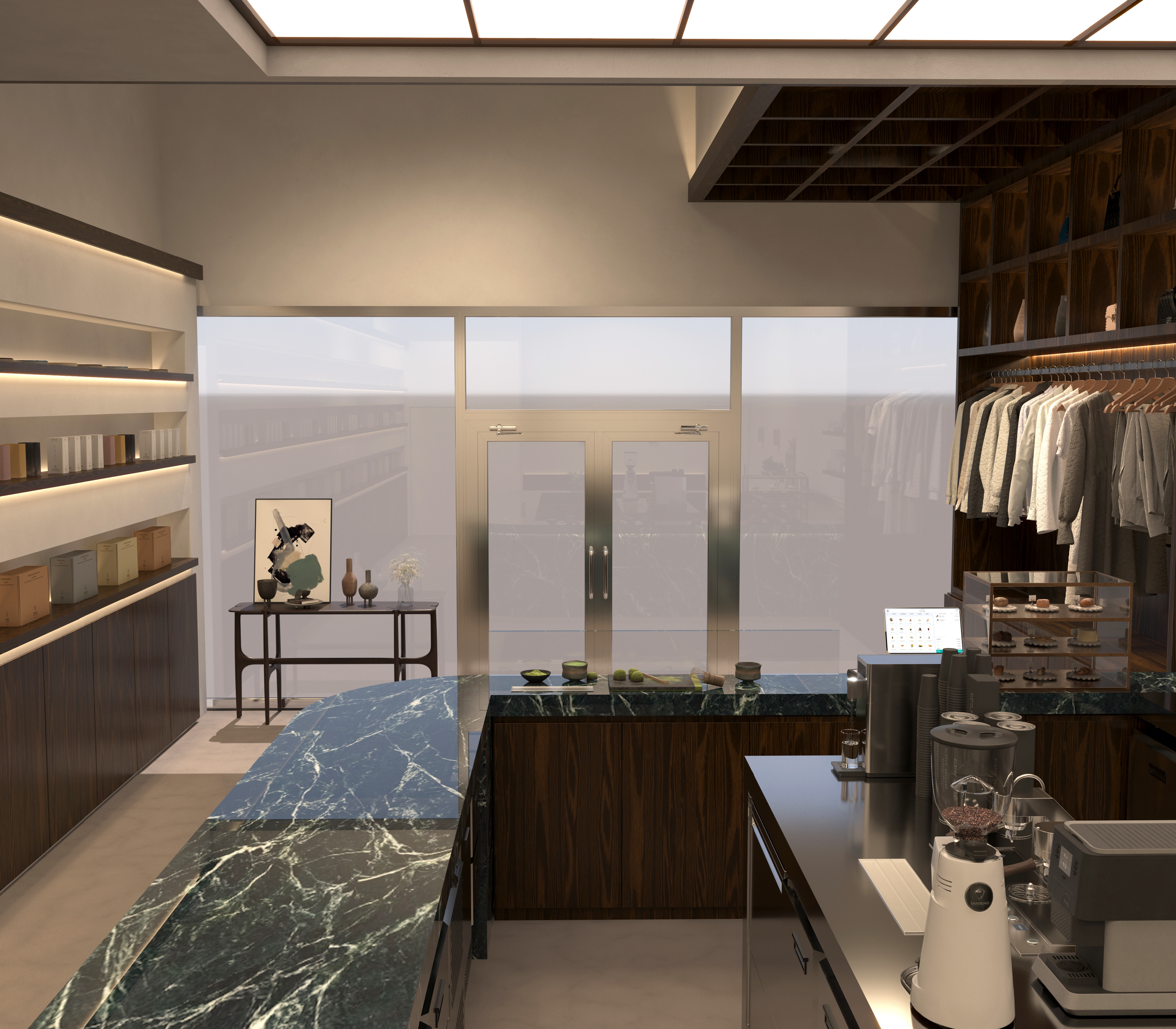An Eastern-inspired aesthetic with an open kitchen layout, featuring a green, brown, and beige color scheme. A cultural destination designed for sharing and experiencing culture.